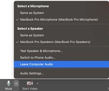 - On the Zoom screen, click on the microphone icon and click on “leave the computer audio”